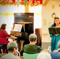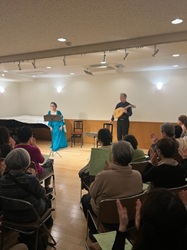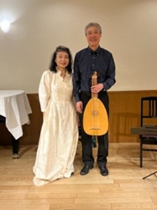 昨年は、長年願っていたリューティストの水戸茂雄氏との久々の共演が、叶った。氏とは、三十年近く前に知人の紹介で、高松、福山、倉敷の美術館コンサートをめぐり、その後も横浜美術館でもコンサート、企業のロビーコンサートと一時期ご一緒する機会に恵まれていた。 それから、氏の演奏を聴く機会はあっても、なかなかご一緒叶わず⋯。 歌う時間が限られてきた今、もう一度!とお願いした。 嘗てより研鑽を積まれた氏は、益々リュートの時代のスペシャリストとなられ、私の方は、あの頃何も知らないで楽しくやっていた思いとは変わり、氏の世界に私がお邪魔する感覚で、大変な責任感に襲われた。 果たして、勉強が足りたのかは分からないのだが、何も言わず(これが⋯怖い(+_+))、伴奏してくださった。 氏と、聴きに来てくださったお客様に、心より感謝しています。 ![]() ![]() 昨年最後の演奏は、毎年恒例となった埼玉県内での、ボランティアコンサート。 今回はいつも共演するバイオリンがお休み、とのことで、曲数が増えた。(クリスマスカラーのドレスを二人で着ている) リュートとのコンサートの疲れが残ったままの練習で、なかなか調子が上がらない。 けれど、当日、お客様の目がぱっちりとこちらを向き、多分耳までもがぱっちりなさっている様に感じた私は、歌いながら調子がグングンと上がり、ずっと出なかった、 滑らかさが本番で戻った。声が戻った。良いお客様のお陰だった。 ![]()